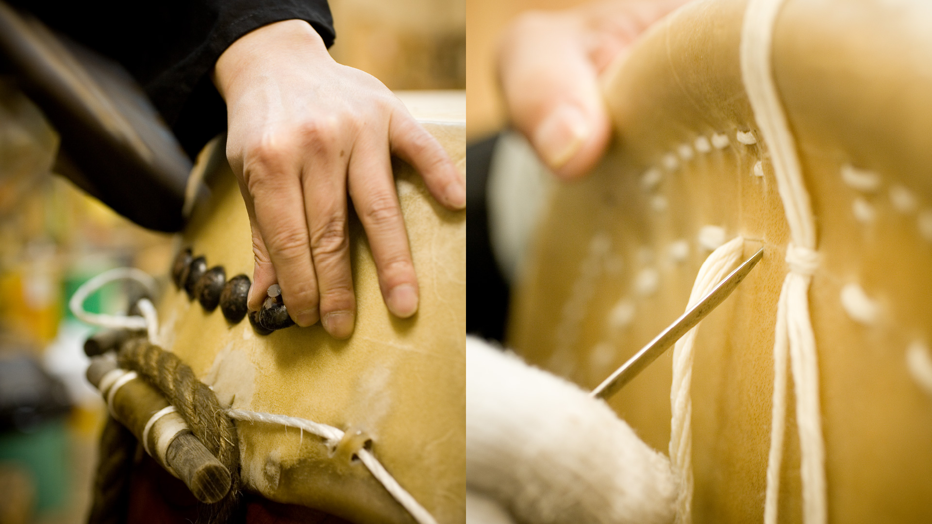 - ジャッキを使い皮を均等に引っ張りながら音の調整を行う